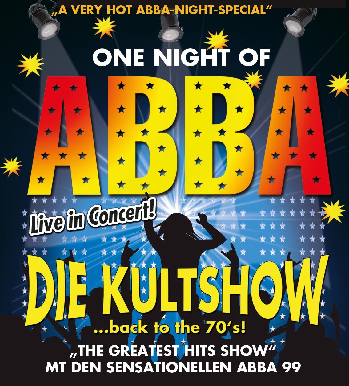 In einer 2-stündigen Konzert-Show voller Power und Hits wird das Publikum zurück in die 70er entführt! Plateauschuhe, Schlaghosen und Glitzerschals sowie das Lebensgefühl dieses Jahrzehnts sind an diesem Abend angesagt! Die „GREATEST HITS-SHOW“ wird präsentiert von den fantastischen „Abba 99“, da heißt es „anschnallen und abheben!“ Es wartet auf euch eine der populärsten ABBA-Show-Bands des Kontinents!